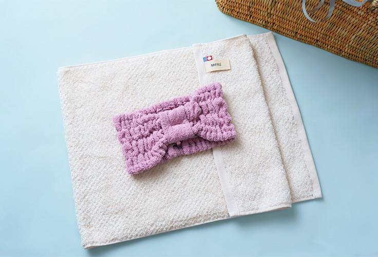 吸水性のよいタオル生地で作られた、フィット感が心地よい”ヘアーバンド”と、 思わず顔をうずめたくなる、もふもふした風合いの”モッフル”のフェイスタオルの限定セットとなっております。