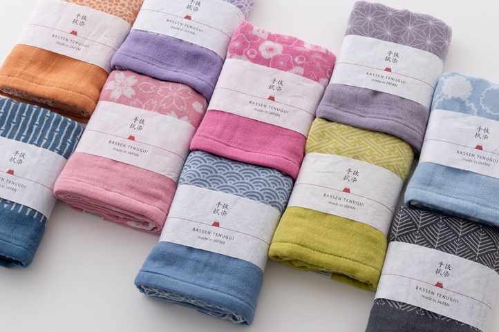 ハイカラ抜染手拭はタオル織機で織り上げた三重ガーゼ生地を日本の伝統色と文様で染め抜きました。タオル織機ならではの優しい風合いと使い心地の良さが有ります。