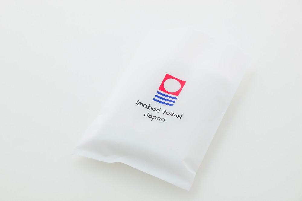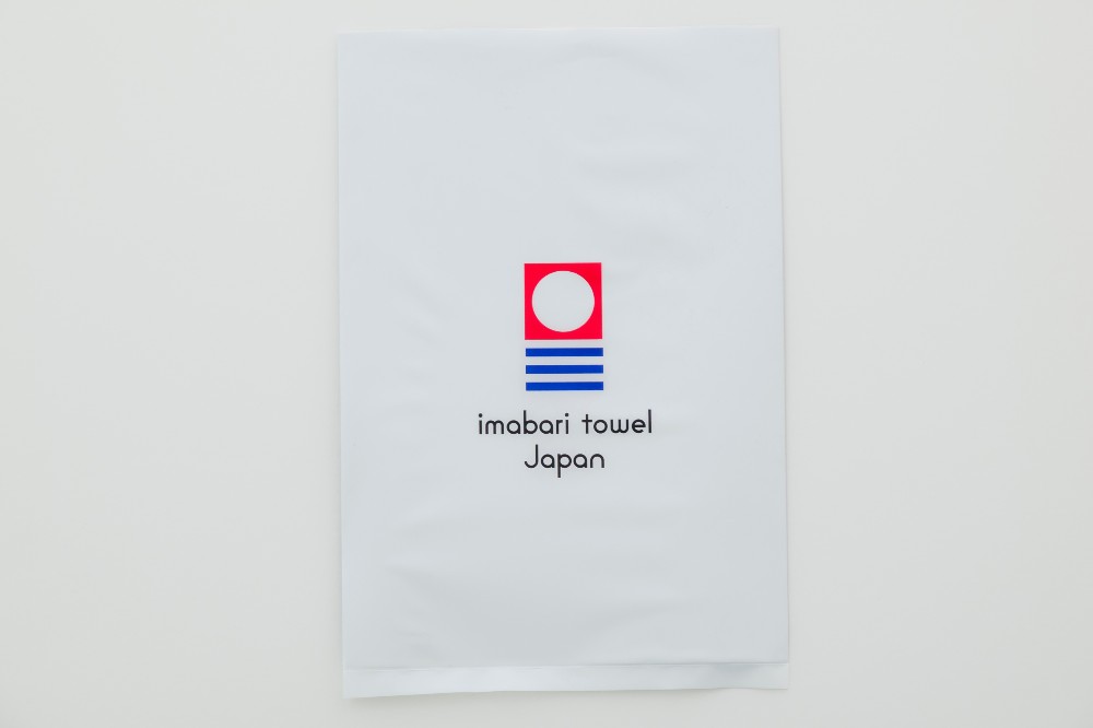乳白色で中央に今治タオルのロゴを配置したシンプルなデザインです。