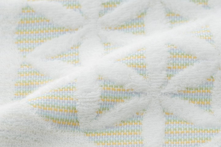 光沢感やしなやかさがある綿を使った無撚糸(撚りの無いフワフワな糸)をパイルに使用し、最高級のやわらかさと軽さを表現しました。白いパイルのキャンパス上には縁起が良いとされる亀甲模様にアレンジされた今治の花「ツツジ」の群生が鮮やかに描かれており、タオルを使う方が自然豊かな今治を想い浮かべて楽しめるようなデザインとなっております。