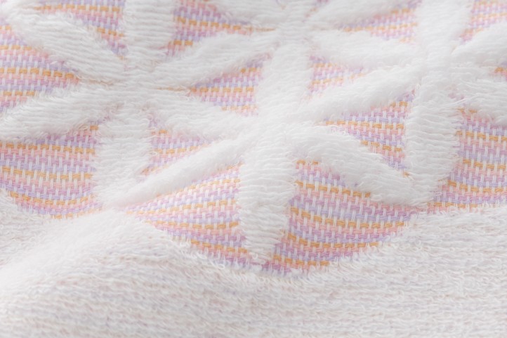 光沢感やしなやかさがある綿を使った無撚糸(撚りの無いフワフワな糸)をパイルに使用し、最高級のやわらかさと軽さを表現しました。白いパイルのキャンパス上には縁起が良いとされる亀甲模様にアレンジされた今治の花「ツツジ」の群生が鮮やかに描かれており、タオルを使う方が自然豊かな今治を想い浮かべて楽しめるようなデザインとなっております。