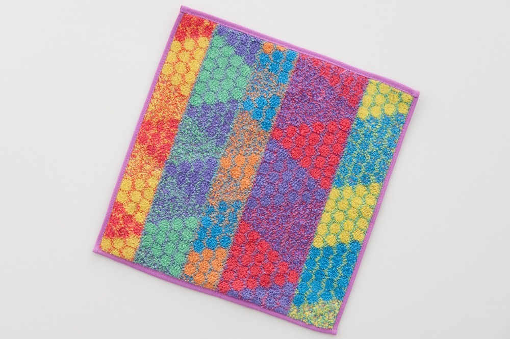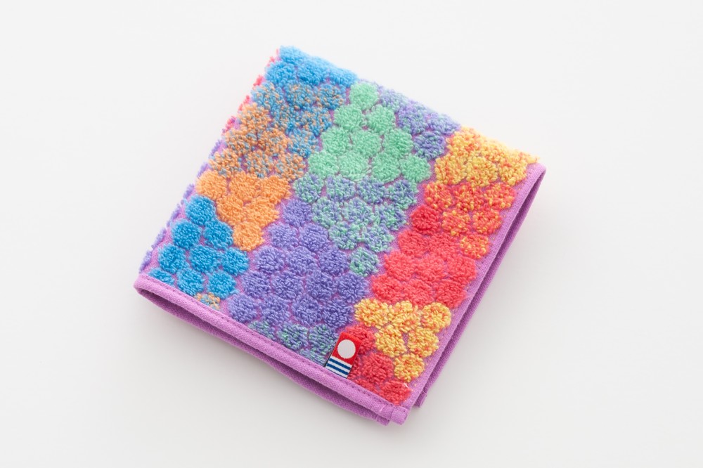 2021年愛媛県が主催する障がい者アートコンペにおいて、最優秀アイデアに選ばれ大磯タオルとタッグを組み商品化された”プチプチ”。原画はなんと気泡緩衝材、いわゆる”プチプチ”1つ1つにマーカーで色を塗ったもので、横道さんの繊細な感性から生み出された色合いやプチプチ感が忠実に再現されています。