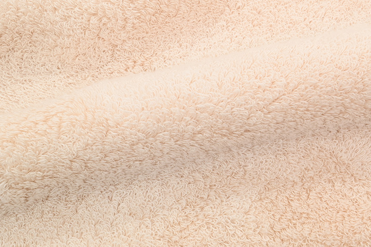 70年以上前に高級肌着用に研究・開発されたピマ超長綿をベースに、オーストラリア綿とサンホーキン綿をブレンドしたオリジナルの綿糸を「極甘撚り」にして織り上げました。無撚糸でもなく甘撚りでもない、中間の撚り糸を、このタオルではロングパイルにして密度を高めて織っています。 密度は一般的なタオルと比べて約1.2倍と高密度。