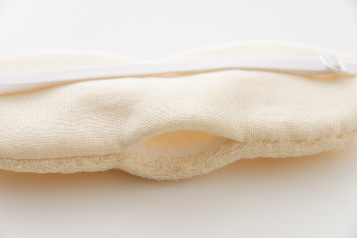 表面はふんわりとしたパイル地、裏面は肌当たりの良いガーゼ地のリバーシブルで使えるアイマスクです。 頭の周りを包み込むゴムタイプで、お好みの長さに調節が可能です。
