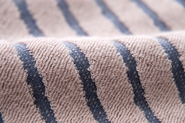 2色の色糸を引き揃えにすることで奥行きのある仕上がりを目指しました。 落ち着いた色合いで、男女問わず使いやすいデザインのスポーツタオルです。