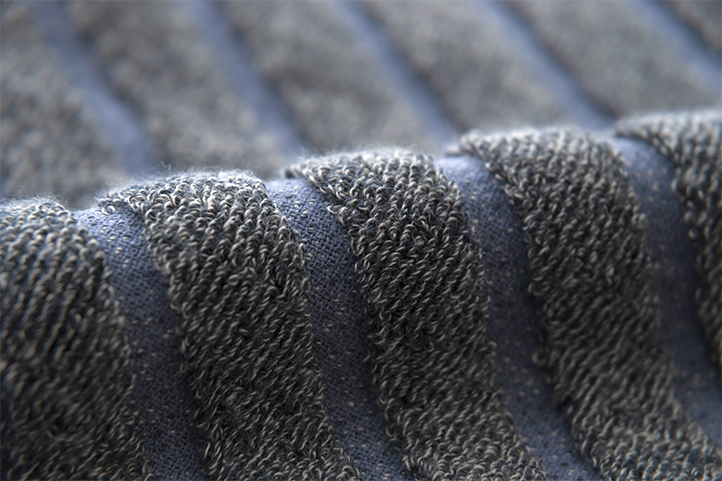 2色の色糸を引き揃えにすることで奥行きのある仕上がりを目指しました。 落ち着いた色合いで、男女問わず使いやすいデザインのスポーツタオルです。
