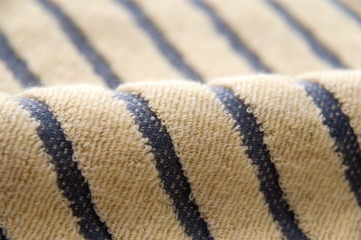 2色の色糸を引き揃えにすることで奥行きのある仕上がりを目指しました。 落ち着いた色合いで、男女問わず使いやすいデザインのスポーツタオルです。