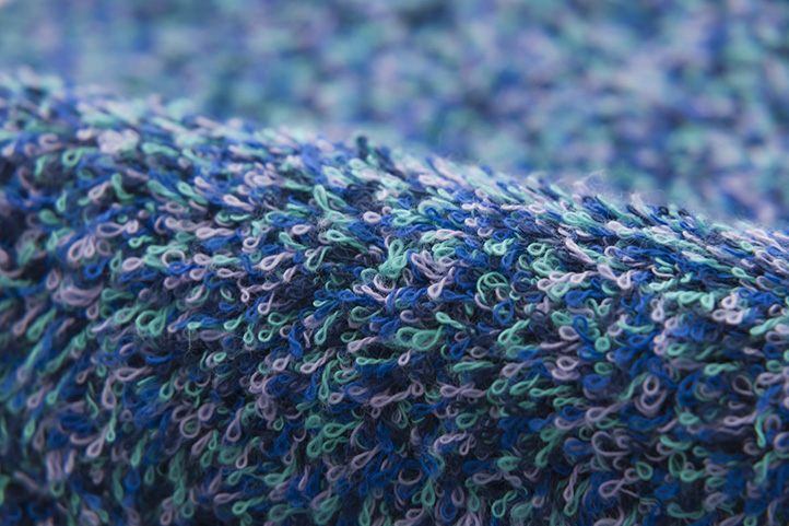 1枚のタオルに織り込まれた4色の糸が微妙に溶け合い、深みのある色味が空間を明るく彩ります。 ブルー、グリーン、グレー、ライトピンクの4色展開で、毎日の気分にあわせてお選びいただけます。