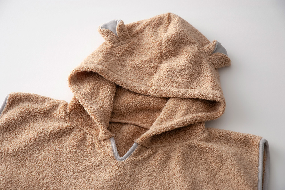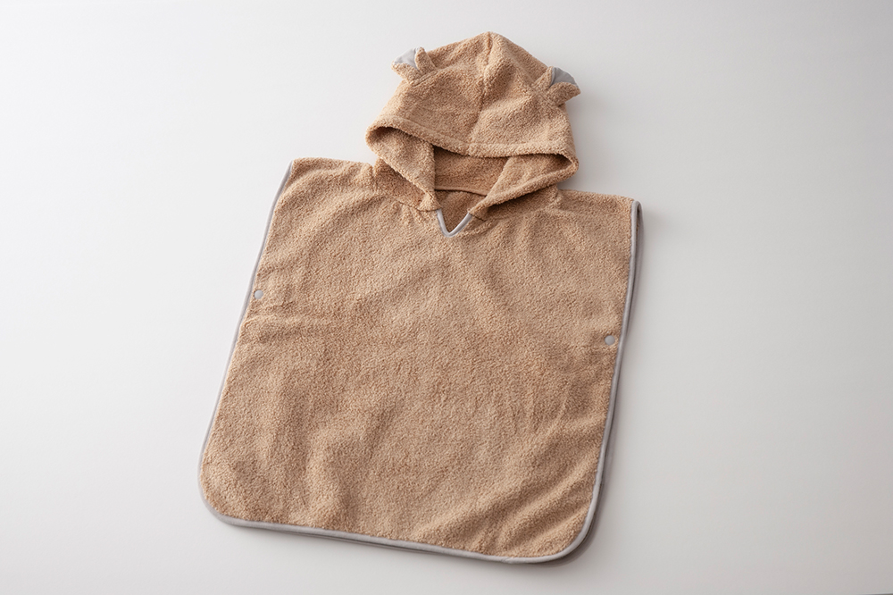 赤ちゃんの暮らしに「あったらいいな」をカタチにしたベビーシリーズ「MOCO(モッコ)」のフードにクマ耳が付いたかわいいポンチョです。