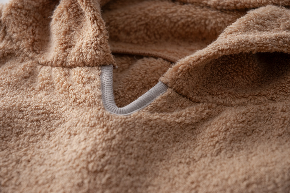 頭からかぶせてサイドのボタンを留めるだけなので着脱もとても簡単。さっと軽く水分を拭き上げた後に頭からすっぽりかぶせておけば、髪の毛から滴る水で体が冷えることもなく安心です。