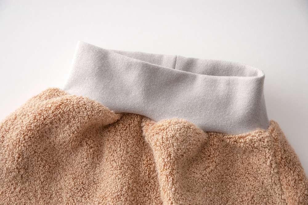 コットン100%の優しい肌ざわりは天然素材とは思えないモコモコ感と柔らかさで、まるでフリースのような触り心地です。 汗をかいても蒸れにくく、吸水性に優れているのでお子さまも快適に過ごせます。無地なのでどんなトップスとも相性が良く、コーディネートの幅を広げてくれます。