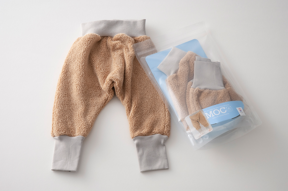 赤ちゃんの暮らしに「あったらいいな」をカタチにしたベビーシリーズ「MOCO(モッコ)」の赤ちゃんならではのぽっこりおなかや、お尻まわりを締め付けない幅広ウエストのサルエルパンツです。
