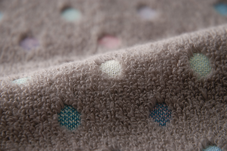 表面と裏面で異なる色のタオルに、多色の糸が織りなす色彩豊かなドット柄が可愛らしいデザインです。 一見普通のドット柄に見えますが、よく見ると複数の糸を使用したマルチカラーで、さり気なさの中にも老舗タオルメーカーのこだわりと技術力が感じられます。