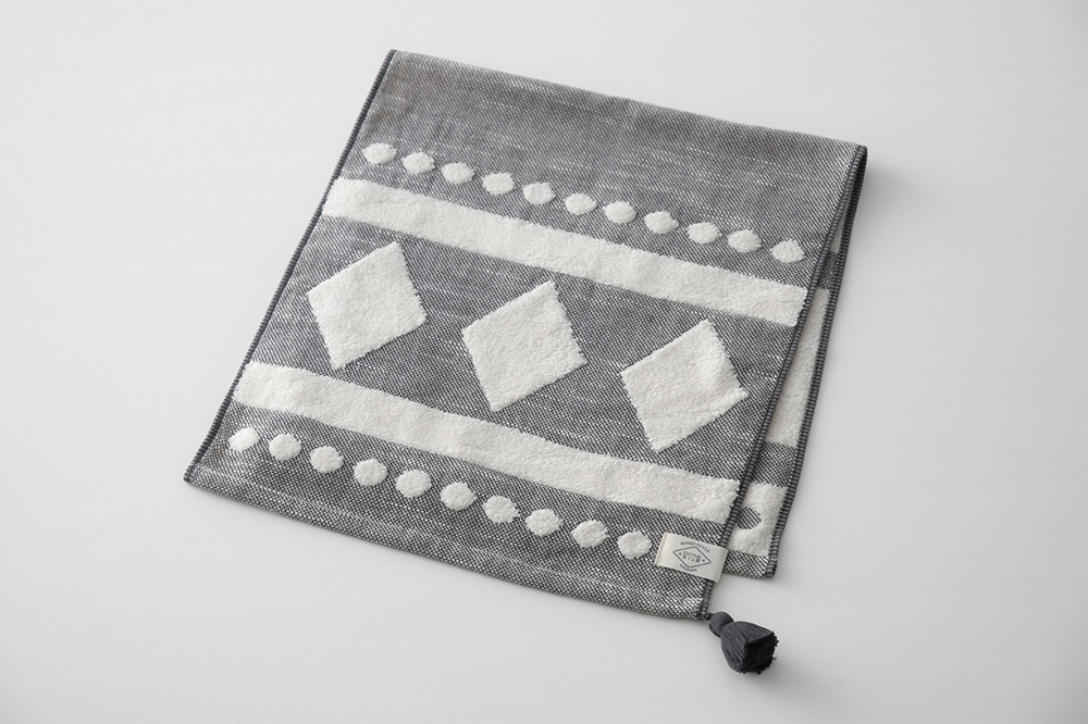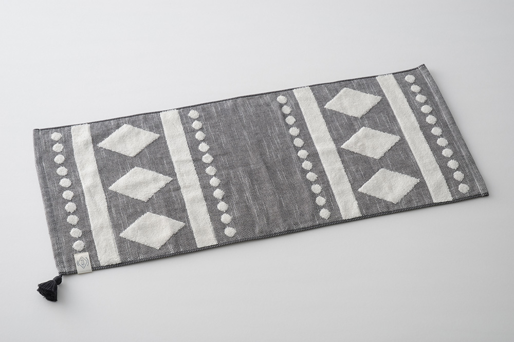 柄にはモロッコのベニワレン地方で織られたラグにみられる菱形の模様を取り入れました。 菱形には「家を守る」といういわれがあり、昔から嫁入り道具として使われています。 タオル地の色にマッチしたタッセルがアクセントになっており、おしゃれさがグッと引き立ちます。