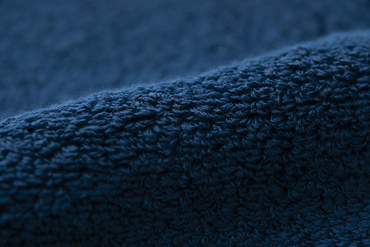高級ピマコットンのカバーリング糸を贅沢に使用しており、長いパイルと高密度の織りによって、寛ぎのひとときにふさわしい柔らかさと充分な量感を実現しました。仕上げにも工夫を重ね、四方を額縁縫いにすることで端までやわらかな肌触りが続きます。