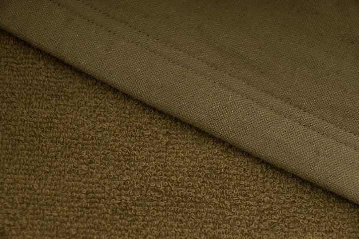 表ガーゼ・裏パイル地となっており、ガーゼ面でさらりとした肌ざわりを感じつつ、パイル面で汗を吸収してくれる、まさにタオルを着ているような感覚を味わえます。さらに、汗をかいてもベタつかず、生地に汗じみがでにくい点も嬉しいポイント。