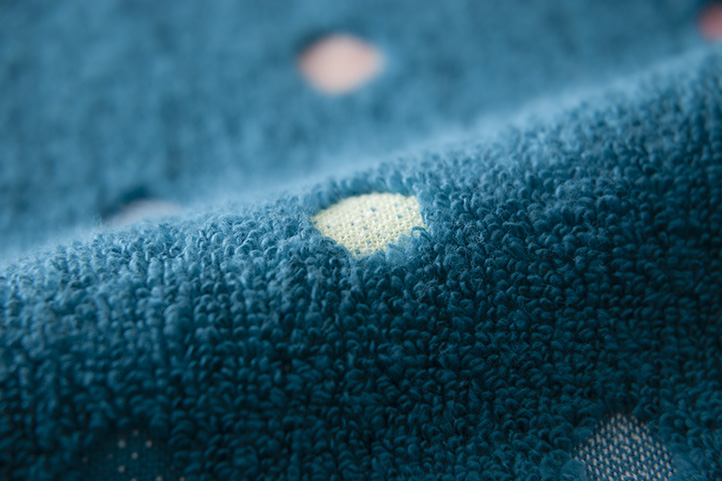 表面と裏面で異なる色のタオルに、多色の糸が織りなす色彩豊かなドット柄が可愛らしいデザインです。一見普通のドット柄に見えますが、よく見ると複数の糸を使用したマルチカラーで、さり気なさの中にも老舗タオルメーカーのこだわりと技術力が感じられます。