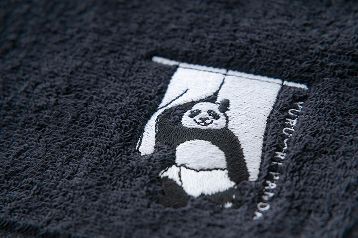 のれんをくぐるゆる~いパンダの刺繍が可愛らしいタオルハンカチです。最高級超長綿ピマコットンを使用したオリジナル綿糸を使用することで、毛羽が少なくふんわりとした肌触りのタオルが出来ました。