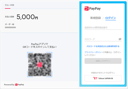 お支払い詳細の画面が表示されますので、PayPayアプリでQRコードをスキャンするか、PayPayにご登録済みの携帯電話番号とパスワードでログインをしてお支払いください。